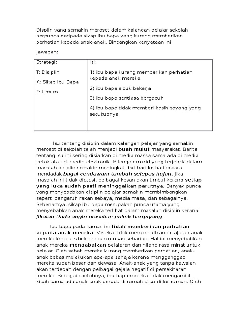 Contoh Karangan PT3 Peranan Pelbagai Pihak dalam Menangani Masalah Disiplin Pelajar Rata-rata masyarakat hari ini sedang kebingungan dengan fenomena keruntuhan akhlak dan masalah disiplin dalam kalangan pelajarPelbagai persoalan ditimbulkanApakah pihak sekolah selaku institusi pendidikan gagal menangani masalah ini Bagaimanakah pula peranan ibu bapa dan. Masalah disiplin seperti buli ponteng sekolah dan vendalisme semakin hangat diperkatakan oleh masyarakat dan juga terpampar di dada akhbar hampir setiap hari. Karangan yang cemerlang harus mempunyai isi-isi yang menarik.